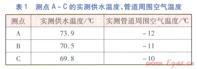 當(dāng)室外溫度比較接近時(shí),測(cè)點(diǎn)A~C的實(shí)測(cè)供水溫度、管道周圍空氣溫度見(jiàn)表l。