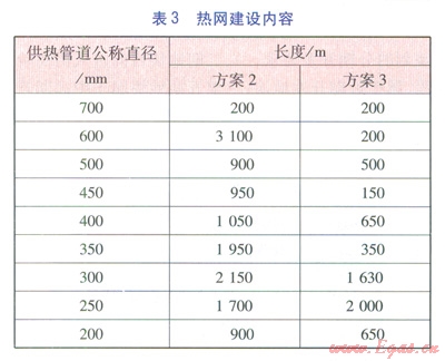 方案l~3各分項工程建設內容分別見表2~6。表3中的熱網指一級管網,由于二級管網(包括分散式低溫燃氣鍋爐房至熱用戶的管網)造價由用戶分攤,因此不計入熱網造價中。由表2~6可計算得出方案l~3的工程造價分別為35237.74×104、43004.35×104、41047.11×104元。
