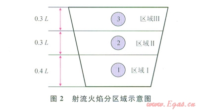 Palacios,Gomez Mares等學(xué)者[8-11]通過大量實(shí)驗(yàn),研究了高速射流火焰的火焰溫度和熱輻射特性,提出射流火焰按照表面溫度特性和表面熱輻射功率可將其分3個(gè)區(qū)域來分析(圖2):區(qū)域I是火焰底部到火焰整體長度的2/5處,區(qū)域Ⅱ是火焰整體長度2/5處至火焰整體長度7/10處,區(qū)域Ⅲ是指火焰整體長度7/10處到火焰頂。并將這種分區(qū)域理論應(yīng)用到改進(jìn)的固體火焰模型來計(jì)算射流火焰熱輻射。筆者按這個(gè)思路來將圓錐體平截頭模型中計(jì)算出的幾何形狀進(jìn)行分區(qū)域,每個(gè)區(qū)域用1個(gè)輻射點(diǎn)源表示,輻射點(diǎn)源位于區(qū)域的正中央。