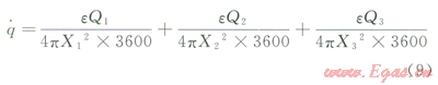 式中e為熱輻射率(輻射熱量與總熱量的比值);X1、X2、X3分別是3個(gè)區(qū)域輻射點(diǎn)源與目標(biāo)物的距離,m。