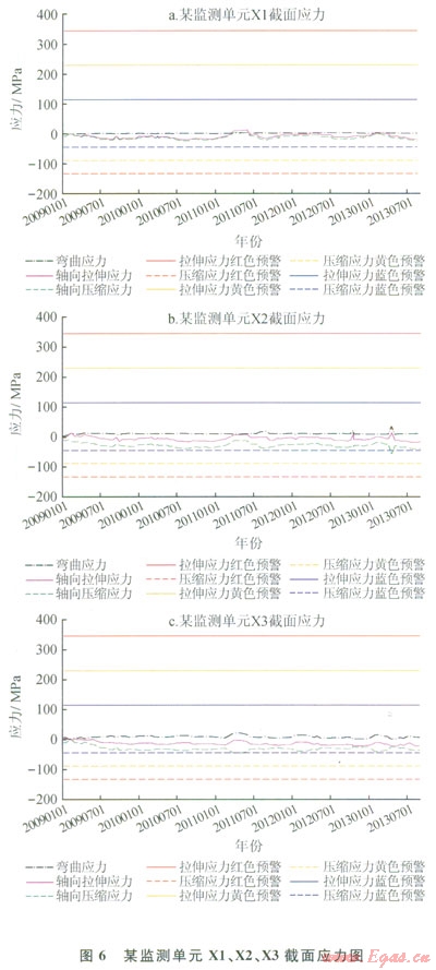 監(jiān)測(cè)系統(tǒng)輸出的各應(yīng)變監(jiān)測(cè)截面軸向附加應(yīng)力如圖6所示。