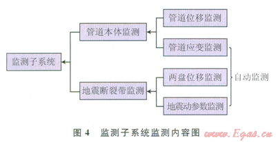 監(jiān)測(cè)傳感子系統(tǒng)用于監(jiān)測(cè)災(zāi)情數(shù)據(jù)源,是管道風(fēng)險(xiǎn)評(píng)價(jià)的基礎(chǔ)信息保障,因此監(jiān)測(cè)的內(nèi)容應(yīng)包含管體應(yīng)變、管體位移、斷層兩盤位移和地震動(dòng)參數(shù)等內(nèi)容(圖4)。