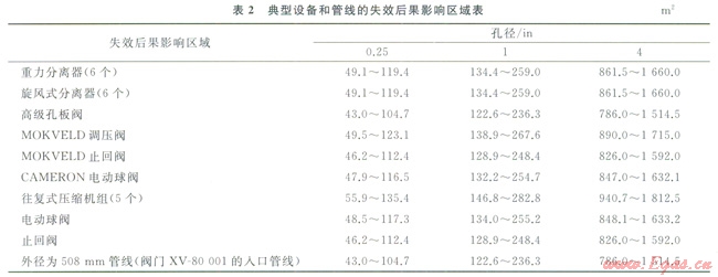 分別按設(shè)備破壞面積和人員的致死事故面積計(jì)算失效后果,由于設(shè)備和管線完全破裂的可能性很小,末計(jì)算破裂的失效后果,主要設(shè)備失效后果影響區(qū)域見表2。