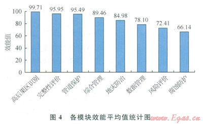 2)各業(yè)務(wù)模塊效能情況。由各評價單元各模塊效能平均值得分統(tǒng)計結(jié)果可以看出,目前,各評價單元在高后果區(qū)識別、完整性評價及管道保護等業(yè)務(wù)模塊平均效能評級為高;綜合管理、地災(zāi)防治等業(yè)務(wù)模塊平均效能評級為較高;數(shù)據(jù)管理、風險評價以及腐蝕防護等業(yè)務(wù)模塊平均效能水平等級為中。