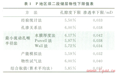 2)采用經(jīng)驗(yàn)統(tǒng)計法、孔滲關(guān)系法、最小流動孔喉半徑法(水膜厚度法、Purcell法、Wall法)、產(chǎn)能模擬法、物性試氣法等多種方法,綜合確定出川中P地區(qū)須二段低孔低滲儲層的物性下限為:孔隙度下限5.85%,滲透率下限0.037mD。通過多種方法相互驗(yàn)證,避免了因方法單一而在物性下限取值時可能產(chǎn)生的較大偏差,確定出的儲層物性下限值得到了新近試氣資料的證實(shí),為氣藏的儲量計算提供了依據(jù)。