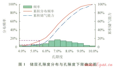 目前,經(jīng)驗(yàn)統(tǒng)計法在國內(nèi)外均得到了較為廣泛的使用[4-6],是一種以巖心測試分析得到的孔隙度和滲透率資料為基礎(chǔ),按照低孔低滲段累計儲滲能力丟失不超過總累計量的5%來劃分物性下限的方法。其中儲氣能力和產(chǎn)氣能力計算公式為: