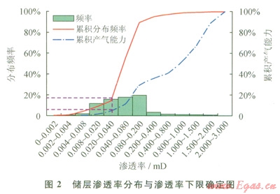 應(yīng)用經(jīng)驗(yàn)統(tǒng)計法劃分P地區(qū)須二段氣藏物性下限效果(圖l、2)。按照儲氣能力丟失5%為界限,確定孔隙度下限值為5.5%,此時樣品丟失率為l6.95%;按產(chǎn)氣能力丟失5%為界限,確定滲透率下限值為0.033mD,此時樣品丟失率為18.24%。以孔隙度5.5%、滲透率0.033mD作為下限值,其儲氣能力和產(chǎn)氣能力丟失都很小,認(rèn)為該下限值是比較合適的。