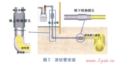 波紋管安裝方法簡單(見圖2),先在庭院靠近樓房的位置開挖一小坑,外露埋地的引入鍍鋅鋼管,將鍍鋅鋼管隔離。然后在地上引入管距地面約lm處拆開接口或引入管閥門,利用專用工具設備及按照廠家提供的操作指引,將波紋管從地上引入管開口一端推進鍍鋅鋼管內,直至波紋管從鍍鋅鋼管另一端埋地開口導出。再利用特制的轉換接頭把兩端凸出的波紋管分別連接至地上金屬管和埋地聚乙烯管道,隨即進行壓力試驗。最后,向轉換接頭上附設的灌漿孔中注入水泥漿,填充波紋管與鍍鋅鋼管內壁之間的空隙,至此修復工作完成。內襯的波紋管受原來的鍍鋅鋼管保護,在一定程度上可降低外力影響。室內安裝方法與此類似。