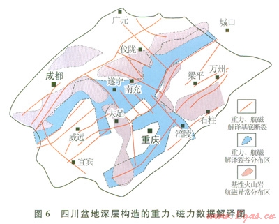 從重力、磁力處理結(jié)果的構(gòu)造解譯看,四川盆地深層構(gòu)造復(fù)雜,基底構(gòu)造形跡總體表現(xiàn)為NE向?;讛嗔岩?span lang="EN-US">NE向?yàn)橹鳎?guī)模最大的有華鎣山斷裂和龍泉山基底斷裂;川中地區(qū)發(fā)育Nw向基底斷裂,但多數(shù)受限于華鎣山斷裂和龍泉山基底斷裂之間(圖6)。通過對(duì)剩余重力異常、磁異常處理,突出深、淺部巖石磁性特征。以切割半徑為5km的2層切割剩余磁異常,向上延拓5km、10km、40km。結(jié)果表明,在綿陽、南充、大足、石柱等存在高磁異常,是盆地內(nèi)基性火山巖的響應(yīng),且緊鄰基底斷裂。對(duì)布格重力異常進(jìn)行切割半徑為5km的1層切割法,求取剩余異常與區(qū)域異常。結(jié)果表明,除大足重力高之外,剩余重力異常呈NE向緊鄰磁異常高分布。結(jié)合巖性分析,認(rèn)為結(jié)晶基底及花崗巖基底表現(xiàn)為弱異常、高重力異常;巨厚的沉積巖表現(xiàn)為弱磁異常及低重力異常;中—基性火山巖表現(xiàn)為高磁異常、中等剩余重力異常。依據(jù)上述信息,推測(cè)四川盆地深層存在裂谷盆地,總體表現(xiàn)為NE向展布,且受基底斷裂控制。裂谷兩側(cè)發(fā)育斷裂與基性火山巖伴生,可能是裂谷初期火山活動(dòng)的表現(xiàn)。根據(jù)區(qū)域資料推測(cè),這套中一基性火山巖可能與川西—滇中裂谷充填的巨厚蘇雄組及川中女基井鉆遇的蘇雄組火山巖為同期產(chǎn)物距今時(shí)間介于803~760Ma之間。而緊鄰火山巖分布為裂谷沉積物充填,表現(xiàn)為重力低值區(qū)。需要指出,在重慶、涪陵、南充、遂寧一帶,存在受NW向斷裂控制的裂谷發(fā)育區(qū),在地震剖面上有較清楚的反射特征響應(yīng),尤其是遂寧大足之間的基底斷裂在地震反射剖面上響應(yīng)特征更為明顯。