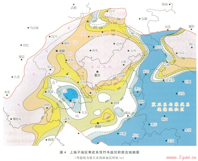近期研究表明,上揚(yáng)子地區(qū)在震旦紀(jì)—早寒武世早期發(fā)生了3幕桐灣運(yùn)動(dòng)。桐灣運(yùn)動(dòng)Ⅰ幕發(fā)生在燈二段末期,Ⅱ幕發(fā)生在燈影組末期,Ⅲ幕發(fā)生在梅樹村末期。運(yùn)動(dòng)性質(zhì)均表現(xiàn)為整體抬升。受其影響,燈二段、燈四段形成了兩套風(fēng)化殼型巖溶儲(chǔ)層。露頭及鉆井資料證實(shí),兩套巖溶儲(chǔ)層不僅在威遠(yuǎn)、磨溪、高石梯等古隆起區(qū)發(fā)育,而且在貴州仁懷的桐梓剖面、凱里的基東剖面以及鄂西地區(qū)的利l井等,均可見風(fēng)化殼型巖溶儲(chǔ)層。把現(xiàn)有的資料點(diǎn)投在上揚(yáng)子地區(qū)筇竹寺組沉積前古地貌圖上(圖4),可以看出無論是侵蝕高地還是斜坡,甚至侵蝕洼地,均發(fā)育巖溶儲(chǔ)層,顯示出區(qū)域性分布特點(diǎn)。這一認(rèn)識(shí)對(duì)拓展燈影組油氣勘探具指導(dǎo)意義。