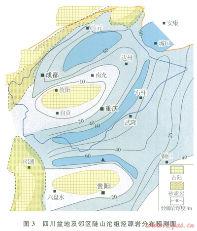 四川盆地腹部?jī)H有少量鉆井鉆遇該層系,且厚度薄,因而這套烴源巖在盆地分布往往不被看好。近期,筆者根據(jù)盆地區(qū)域地震的層位解釋,發(fā)現(xiàn)燈影組底界以下的反射層具有向古隆起超覆沉積的特征,層位應(yīng)歸屬陡山沱組。這表明陡山沱沉積期,上揚(yáng)子地區(qū)存在兩個(gè)同沉積期古隆起,分別是黔中隆起和樂山—龍女寺古隆起陡山沱組烴源巖在古坳陷區(qū)厚度較大,而隆起區(qū)厚度明顯減薄。圖3是筆者根據(jù)地震解釋結(jié)合露頭剖而資料推測(cè)的陡山沱組烴源巖分布圖。從圖3可以看出,資陽古隆起兩側(cè)的川西、川東地區(qū)均存在陡山沱組烴源巖,厚度在20~60m。這一認(rèn)識(shí)大大提升了震旦系含油氣系統(tǒng)的資源潛力。