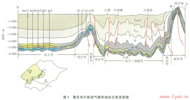 新近紀(jì)以來的喜馬拉雅運(yùn)動(dòng),對(duì)盆地深層震旦系產(chǎn)生4種變形方式:①強(qiáng)烈的褶皺沖斷作用變形,主要發(fā)生在盆地周緣,導(dǎo)致震旦系出露地表,如盆地東南緣的桑木場(chǎng)構(gòu)造;②強(qiáng)烈褶皺、隆升,但震旦系未遭受剝蝕,如威遠(yuǎn)地區(qū)隆升幅度較高(3000~4000m)[30];③中淺層變形強(qiáng)烈,但震旦系未卷入變形或變形微弱,如川東、蜀南地區(qū);④深層及中淺層均未卷入變形或變形微弱,如磨溪—高石梯地區(qū)。除第一變形方式對(duì)震旦系氣藏起破壞作用之外,其余的變形對(duì)震旦系氣藏調(diào)整有影響,但未被破壞?;诖耍蓪⑾采狡谡鸬┫禋獠乜煞譃檎{(diào)整型(如威遠(yuǎn)氣田)、殘存型(如資陽地區(qū))、原生型(如磨溪 高石梯氣田)、原生—調(diào)整型(如蜀南深層)(圖5)。按此評(píng)價(jià)有利勘探區(qū)帶,磨溪—高石梯廣安一帶長(zhǎng)期處于古今構(gòu)造疊合的高部位,是最有利勘探區(qū);有利區(qū)為遂寧—南充斜坡帶,較有利區(qū)為川東—蜀南深層。