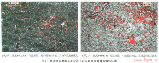 2)具有規(guī)模發(fā)育的白云巖儲集體。處于馬五6亞段膏鹽巖分布區(qū)之下的馬五7、馬五9亞段白云巖沉積時(shí)主體處于靖西臺坪沉積區(qū),多發(fā)育有利的顆粒灘相沉積,后期白云巖化可形成規(guī)模分布的白云巖晶間孔型儲集體。