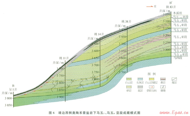 前已述及,馬五6膏鹽巖下發(fā)育馬五7、馬五9亞段及馬四段等多個(gè)儲集層段,其間又為馬五8、馬五10亞段等蒸發(fā)巖組合分隔,各自都具有相似的成藏地質(zhì)背景,因而都具有一定的成藏潛力。其次,即使在馬五8、馬五10亞段乃至馬五6亞段等蒸發(fā)巖層段中也常夾有一定儲集性的白云巖夾層,它們雖在橫向上規(guī)模相對較小,但在局部也可能形成有效的工業(yè)性聚集,對于膏鹽巖下的勘探也有一定的實(shí)際意義。