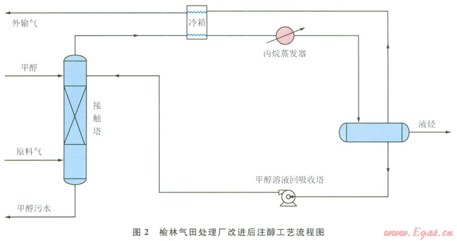 改進后的注醇工藝甲醇溶液回流接觸塔形成了循環(huán)注醇過程,實際上,補充注入的醇是被天然氣帶止而損失的一小部分甲醇,這樣便大大提高了甲醇的利用率。