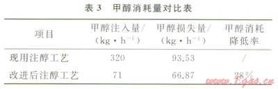3)改進后注醇工藝注醇量減少,甲醇利用率提高。