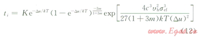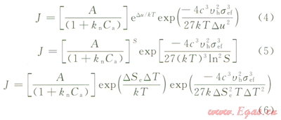 Kashchiev與Firoozabadi[28]通過分析晶體的成核過程,認為水合物的成核首先發(fā)生在氣液接觸面而不是液相的內(nèi)部,基于此,提出了適用于單組分均相成核與三維非均相成核速率模型。研究了添加劑對水合物成核速率的影響,得到了與之相對應(yīng)的模型(4~6)。由于該模型與實驗數(shù)據(jù)吻合較好,更加接近于水合物的真實成核過程,且方程的求解較簡單,因而被廣大學(xué)者所接受。即