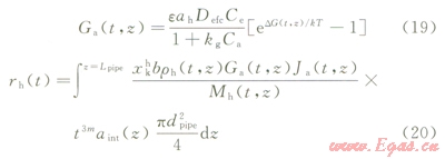 Talaghat等[13-6,45-46]在前人研究的基礎(chǔ)上通過小型循環(huán)管道中水合物的生成試驗,發(fā)展了水合物抑制劑體系下單組分氣體形成水合物的宏觀動力學(xué)生長模型,并通過進行一定的假設(shè),建立了低劑量水合物抑制劑體系下水合物的生成模型,進而通過初始條件及邊界條件對模型進行了求解,在此基礎(chǔ)上針對管道中水合物的生成規(guī)律提出了含水合物抑制劑體系下水合物的生長速率模型和氣體消耗速率模型。