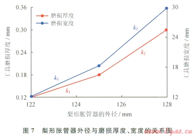 由圖6和表3可知,整形后梨形脹管器工作面的磨損寬度和磨損厚度均隨著工具外徑的增加而增加;由圖7可知,梨形脹管器的磨損量隨著級差的增加而呈非線性增加,表明工具根據(jù)變形套管之間的級差對梨形脹管器的磨損量有很大的影響。因此,為了減小對工具的磨損,應(yīng)該適當減小梨形脹管器之間的級差。