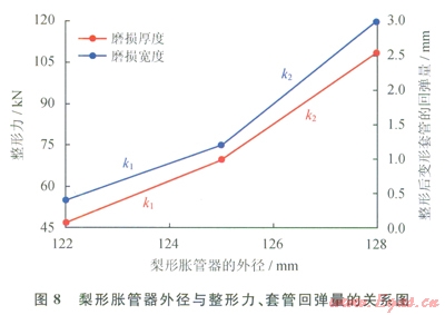 結(jié)合圖7、8分析可以發(fā)現(xiàn)2個十分明顯的現(xiàn)象:①圖中第2個點與第3個點之間的斜率k2遠大于第1個點與第2個點之間的斜率k1,結(jié)合數(shù)據(jù)具體分析可得:在梨形脹管器的外徑為128mm時,其在整形的過程中所需的整形壓力、梨形工具磨損厚度、梨形工具磨損寬度、套管回彈量都顯著增加,由此判斷該組梨形脹管器的外徑級差存在缺陷,在整形過程中容易造成卡鉆等井下事故,應(yīng)該更加合理的優(yōu)化其整形級差;②外徑為l22mm的梨形脹管器對變形套管整形時其整形力、套管回彈量、工具磨損量均較小,由此認為2mm的單次整形量最合理。