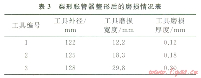 由于在整形過程中梨形脹管器與套管內(nèi)壁發(fā)生了較大的摩擦接觸,造成梨形脹管器發(fā)生了不同程度的磨損(圖6)。通過用游標卡尺對整形后梨形脹管器的磨損寬度和厚度進行測量,可以得到梨形脹管器的磨損量,其具體的磨損結(jié)果見表3。