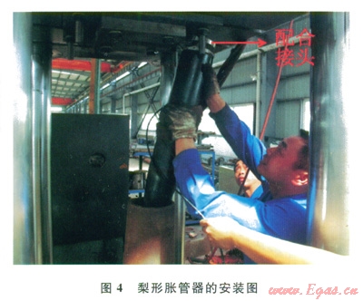 5)將帶配合接頭的梨形脹管器固定于頂部夾具,要求梨形脹管器處于變形套管中心(圖4)。