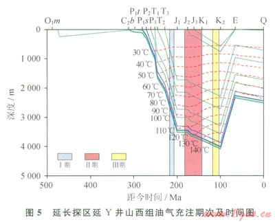 山西組砂巖中流體包裹體的測溫結(jié)果表明:①延長地區(qū)上古生界山西組至少存在3期流體活動,第Ⅰ期流體活動的主峰溫度在85~90℃,規(guī)模較?。坏?span lang="EN-US">Ⅱ期流體活動的主峰溫度在115~120℃,這期流體形成了大量石英加大邊;第Ⅲ期流體活動的主峰溫度在135~155℃,流體規(guī)模較大。②高于l65℃的樣品點(diǎn)34個(gè),溫度范圍較分散。③從測點(diǎn)數(shù)日來看,110~165℃區(qū)間內(nèi)的數(shù)據(jù)點(diǎn)較多,共計(jì)482個(gè)。在3期流體活動中均檢測到含烴包裹體,因此推測其與油氣充注有關(guān)。將流體包裹體的均一溫度投影在單井埋藏史圖上(圖5),發(fā)現(xiàn)3期油氣充注分別發(fā)生在晚三疊世、中晚侏羅世和早白堊世。