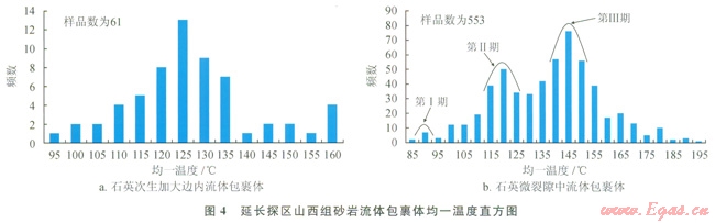 流體包裹體分析是研究油氣運(yùn)移充注期次的有效手段。選取山西組22個(gè)砂巖樣品進(jìn)行流體包裹體分析,根據(jù)鏡下觀察結(jié)果,流體包裹體主要分布在石英次生加大邊及石英顆粒微裂隙,其中砂巖石英次生加大邊內(nèi)流體包裹體均一溫度(圖4-a)分布在94.2~159.3℃,主峰溫度區(qū)間位于115~135℃;砂巖石英微裂隙中流體包裹體均一溫度(圖4-b)分布在82.7~193.8℃,并分為3個(gè)溫度區(qū)間,分別是80~95℃、95~130℃、l30~195℃,主峰溫度區(qū)間位于85~90℃、ll0~125℃和l35~155℃。石英加大邊內(nèi)流體包裹體的均一溫度主峰區(qū)間與石英裂縫中的第Ⅱ期流體包裹體均一溫度的主峰溫度區(qū)間相近,應(yīng)該屬于同一期酸性流體活動。