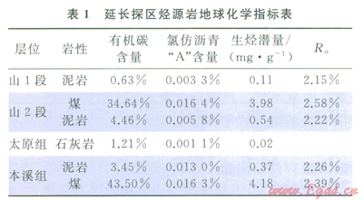 延長探區(qū)上古生界烴源巖為海陸交互相暗色泥巖、煤層及生物屑灰?guī)r,層位主要分布于下二疊統(tǒng)山西組、中石炭統(tǒng)本溪組和上石炭統(tǒng)太原組,平面分布穩(wěn)定,其中山西組泥巖厚度介于70~80m,煤層厚度介于l~7m,主要分布于山2段;太原組石灰?guī)r厚度介于10~40m,本溪組泥巖厚度介于l5~35m,煤層厚度介于1~6m。從地球化學(xué)指標(biāo)來看(表1),山l段泥巖生烴條件較差,平均有機(jī)碳含量僅為0.63%,山2段和本溪組較好,其泥巖有機(jī)碳含量大于3%,煤層有機(jī)碳含量大于30%;太原組石灰?guī)r有機(jī)碳含量為1.21%,氯仿瀝青“A”含量和生烴潛量指標(biāo)均較低。上述情況表明:該區(qū)主力烴源巖為山2段和本溪組暗色泥巖及含煤層系。該區(qū)上占生界烴源巖鏡質(zhì)體反射率(R。)為1.59%~2.65%,普遍超過2%,處于過成熟干氣階段,生烴強(qiáng)度在28×108~40×108m3/km2。生烴量大,氣源充足,具有“廣覆式”生烴特征[3-9]。