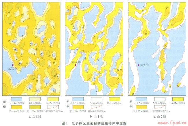 延長探區(qū)主力氣層為本溪組、山23層和山1段、下二疊統(tǒng)石盒子組8段。其中本溪組為潮坪—障壁島海岸沉積[10],儲集體類型主要為障壁島砂壩和砂坪,單個(gè)砂體規(guī)模較小,厚度介于2~10m,橫向連續(xù)性較差,平面分布零散,但主要分布于探區(qū)東南部;山西組和盒8段為湖泊—三角洲沉積體系,主要儲集體類型為三角洲前緣水下分流河道砂體,河口壩不發(fā)育,受盆地北緣物源影響,砂體呈南北向展布,東西呈透鏡體狀,厚度介于4~20m,其中盒8段砂體最為發(fā)育,分布范圍廣,厚度大(圖1)。各層位砂體垂向疊置,橫向連片,形成大面積復(fù)合砂體帶,是該區(qū)儲層砂體空間展布的基本特征。