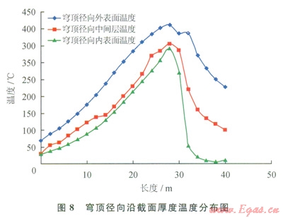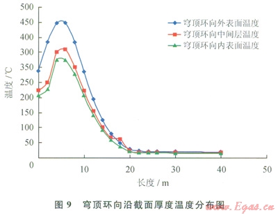 穹頂混凝土的外表面溫度無論是徑向還是環(huán)向,最高溫度均在450℃左右。內(nèi)外表面溫度相差l00℃左右,將產(chǎn)生較大的溫度應力(圖8、9)。