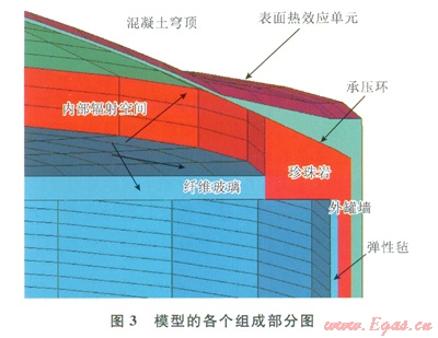 儲罐瞬態(tài)熱力分析模型包含穹頂和混凝土外罐墻。局部還有結構的鋼內(nèi)襯板、玻璃纖維彈性氈、珍珠巖保溫材料和鋼筋混凝土承壓環(huán)。其穹頂厚度約為400mm。