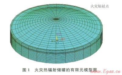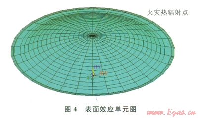 其中承壓環(huán)及襯板用shelll31單元建立、其他部分可用實體單元solid70。有限元模型求解的是連續(xù)體問題,但在此模型中,安全閥的位置離穹頂約16m,是非連續(xù)孤立的節(jié)點。為了能讓安全閥的熱輻射能傳遞到穹頂。必須借助一類特殊的單元即表面效應單元,實現(xiàn)孤立火災點和儲罐各個部分的熱輻射。