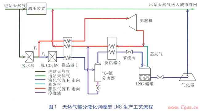 液化回路的天然氣凈化后先通過換熱器1溫度降低,經(jīng)氣一液分離器分離出冷凝液后進(jìn)入換熱器2,高壓天然氣冷凝液化,然后通過節(jié)流閥節(jié)流降溫降壓,再進(jìn)入LNG儲罐,未液化氣體及蒸發(fā)氣與膨脹機(jī)膨脹后的天然氣匯合,進(jìn)入換熱器2。生產(chǎn)的液化天然氣在用氣高峰時氣化調(diào)壓送入城市管網(wǎng),起到調(diào)峰作用(圖1中藍(lán)色線條部分)。