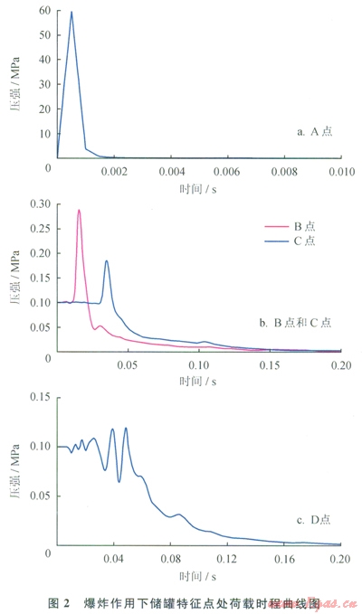 儲罐各特征點(diǎn)處在爆炸作用下的荷載時程曲線如圖2所示,由于E、F兩點(diǎn)距離爆心較遠(yuǎn),其超壓現(xiàn)象不明顯,本文并未示出這兩點(diǎn)的相應(yīng)曲線。比較前3個特征點(diǎn)的荷載時程曲線,其極值分別為59.15MPa、0.28MPa和0.18MPa;峰值出現(xiàn)時間分別為0.5ms、15.1ms和35ms;正壓區(qū)作用時間分別為2ms、8ms和10.5ms。本文參考文獻(xiàn)[14]中給出了裝藥密度為1630kg/m3時TNT炸藥所形成空氣沖擊波的初始值,其初始波后壓力為54.35MPa,傳播速度為6450m/s.