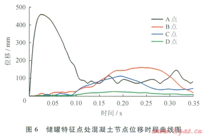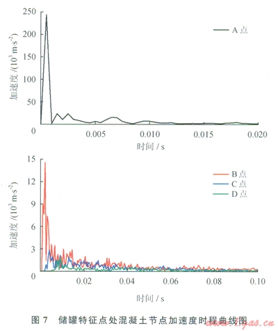 圖7為儲罐特征點(diǎn)A~D處混凝土節(jié)點(diǎn)加速度時程曲線。由圖7可見,各點(diǎn)加速度峰值均出現(xiàn)在初始加載階段,而后反應(yīng)大幅下降,并伴有鋸齒形劇烈振蕩,振蕩現(xiàn)象隨著爆心距的增加而愈加劇烈。這一現(xiàn)象的原因?yàn)檎ㄋ幈ê蠼o儲罐穹頂一個極大的初始加速度荷載,引起各特征點(diǎn)處加速度出現(xiàn)一個脈沖峰值,而后出現(xiàn)的鋸齒形振蕩則是由儲罐的自振引起的。將圖5~7與圖2的荷載時程曲線相對比,叮以看出,沖擊波波陣面的傳播對混凝土單元的應(yīng)力影響很大,但對于其加速度響應(yīng)影響不大。以C點(diǎn)為例,其荷載峰值出現(xiàn)在35ms處,此時其相應(yīng)的應(yīng)力出現(xiàn)了一個脈沖峰值,而其加速度響應(yīng)未有明顯波動。