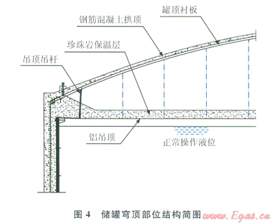 從圖4中可以看出,穹頂結(jié)構(gòu)上部僅由外部鋼筋混凝土拱頂和厚度為6mm的罐頂襯板組成,其下懸掛吊桿和鋁吊頂,鋁吊頂上填充珍珠巖或玻璃棉保溫層,鋁吊頂距離正常操作液位約500mm。如上所述,如果外罐頂出現(xiàn)爆坑,沖擊波進(jìn)入罐內(nèi),雖然其沖擊荷載已急速衰減,但沖擊波會對鋁吊頂上部的保溫層造成破壞,引起火災(zāi)、爆炸等次生災(zāi)害。