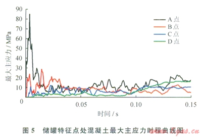 C點(diǎn)在4.5ms時也出現(xiàn)了一個l0.7MPa的脈沖峰值,原因同上;在24.8ms出現(xiàn)一個ll.9MPa的峰值響應(yīng),是由于空氣沖擊波波陣面?zhèn)鞑サ?span lang="EN-US">C點(diǎn)所致,其后應(yīng)力急劇下降并伴有高頻鋸齒振蕩[16]。從圖5中可以看出D點(diǎn)在80ms以前應(yīng)力持續(xù)小幅振蕩,80ms以后為大幅低頻響應(yīng),如3.1節(jié)中所述,這一現(xiàn)象與其特殊的位置和構(gòu)造有關(guān),爆炸沖擊波在此處連續(xù)作用于罐體,導(dǎo)致罐體疲勞損傷??傮w來說,A、B點(diǎn)雖未發(fā)生破壞,但均已處于較高的應(yīng)力水平,C點(diǎn)至F點(diǎn)混凝土的應(yīng)力響應(yīng)均在安全范圍之內(nèi),這也印證了前述900kg當(dāng)量為罐體抗爆極限值的結(jié)論。