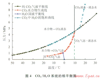 對(duì)管道安全運(yùn)行影響最大的雜質(zhì)就是水。從大多數(shù)源頭捕獲的CO2混合氣體都含有一定量的水。實(shí)際含水量隨氣體來源不同而變化。例如,利用氨吸收法從煙道氣中捕集的CO2中含水量的體積分?jǐn)?shù)通常超過5%。絕大部分的水在壓縮及脫水階段(常采用三甘醇)被脫除。而來自于煤氣化工藝的CO2通過低溫甲醇洗分離工藝,只含有0.0002%的水。