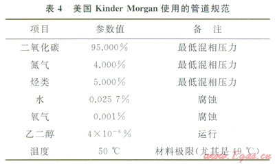 日前運(yùn)行的管道中所輸送的CO2混合物及對(duì)純度和含水量的規(guī)定等都不盡相同。國(guó)際上對(duì)于管道系統(tǒng)輸送CO2混合氣體的組成要求沒有統(tǒng)一的標(biāo)準(zhǔn)。混合氣體的組成要求很大程度上取決于設(shè)計(jì)階段進(jìn)行的評(píng)估,包括流動(dòng)安全、管道完整性、安全性及終端用戶對(duì)CO2純度的需求。美國(guó)Kinder Morgan使用的管道規(guī)范見表4[12]。