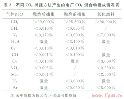 電力行業(yè)是主要的CO2排放源。電廠CO2捕捉的3個(gè)主要方法是:①燃燒前捕集;②燃燒后捕集;③氧化燃料。使用不同CO2捕捉方法所產(chǎn)生的CO2混合氣體雜質(zhì)含量也不同。采用不同CO2捕捉方法得到的典型CO2混合氣體組成情況見表2[2]。CO2混合氣體的組分含量取決于多個(gè)因素,如果對(duì)其他化合物不進(jìn)行純化和聯(lián)合捕捉就會(huì)達(dá)到表2中的最大濃度。通常最終CO2混合氣體中的H2S和SO2含量遠(yuǎn)低于表2所示的最大濃度。