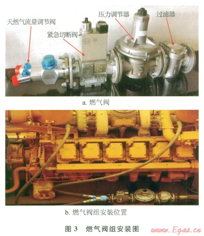 由天然氣流量調(diào)節(jié)閥、緊急切斷閥、壓力凋肯器和過濾器組成(圖3)。過濾器用于濾除天然氣中的污染物以保護(hù)系統(tǒng)和柴油機(jī);壓力調(diào)節(jié)器可以監(jiān)測(cè)柴油機(jī)負(fù)載增減引起的柴油機(jī)真空度變化,從而保持設(shè)定的天然氣進(jìn)氣壓力。緊急切斷閥內(nèi)部包含2個(gè)相互獨(dú)立的“常閉”狀態(tài)的閥門。天然氣流量調(diào)節(jié)閥用于控制給定負(fù)載時(shí)的天然氣流量,可用于設(shè)定天然氣/柴油替代率。