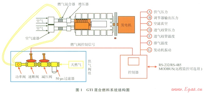 GTI混合燃料技術(shù)是利用美國Altronic公司生產(chǎn)的GTI混合燃料系統(tǒng)對(duì)柴油機(jī)進(jìn)行改造的技術(shù)[1]。經(jīng)GTI混合燃料技術(shù)改造的混合燃料發(fā)電機(jī)組,能夠同時(shí)燃燒柴油和天然氣。被改造的機(jī)組在啟動(dòng)和怠速時(shí)按純柴油工作方式運(yùn)行,達(dá)到混燃條件后進(jìn)入混合燃料運(yùn)行模式。GTI混合燃料控制系統(tǒng)允許原柴油機(jī)監(jiān)控系統(tǒng)控制柴油機(jī)的轉(zhuǎn)速,在恒定的負(fù)載下,由于額外吸入了天然氣,柴油機(jī)燃料超出需要,柴油機(jī)的轉(zhuǎn)速輕微增加,為了保持熱值平衡和設(shè)定的轉(zhuǎn)速,監(jiān)控器會(huì)迅速調(diào)節(jié)減少噴油量,從而實(shí)現(xiàn)天然氣對(duì)柴油的替代。反之,當(dāng)已達(dá)平衡狀態(tài)后天然氣供給減少時(shí),柴油機(jī)監(jiān)控器會(huì)迅速實(shí)時(shí)動(dòng)態(tài)地調(diào)節(jié)噴油量,建立新的燃油供給平衡,保持設(shè)定轉(zhuǎn)速,維持柴油機(jī)正常運(yùn)行。