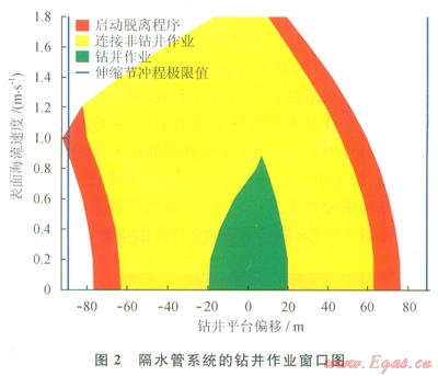 鉆井隔水管系統(tǒng)鉆井作業(yè)窗口分析與確定的目的是明確進行正常鉆井作業(yè)、連接非鉆井作業(yè)和解脫作業(yè)的環(huán)境載荷條件和鉆井平臺偏移范圍,形成相應的綠圈、黃圈和紅圈,可為隔水管的連接作業(yè)提供指導。