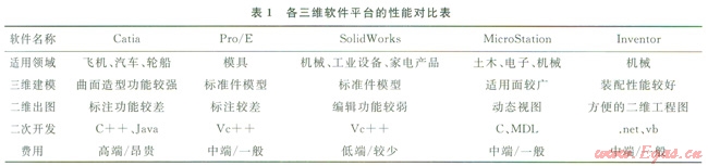 針對(duì)所要開(kāi)發(fā)的系統(tǒng)功能要具有:①參數(shù)化的模型庫(kù);②模型庫(kù)設(shè)備的添加、瀏覽、刪除、編輯等;③自動(dòng)管路設(shè)計(jì);④材料表統(tǒng)計(jì);⑤自動(dòng)出圖;⑥有限元分析接口以及ROV的干涉檢測(cè)等。通過(guò)表l和圖l對(duì)Inventor、Catia、SolidWorks、Pro/E和Microstation等常用三維建模軟件平臺(tái)的用戶數(shù)量、適用領(lǐng)域、功能特點(diǎn)以及其經(jīng)濟(jì)性等數(shù)據(jù)進(jìn)行比較,最終選取了Autodesk Inventor作為水下生產(chǎn)虛擬仿真設(shè)計(jì)系統(tǒng)的開(kāi)發(fā)平臺(tái)。