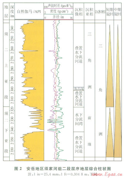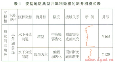 本次研究采用6級(jí)劃分方案(巨旋回、超長期旋回、長期旋回、中期旋回、短期旋回、超短期旋回),筆者以Yl05井為例,將須二段劃分為一個(gè)中期旋回,即一個(gè)上升半旋回,代表基準(zhǔn)面上升,可容納空間增加,對應(yīng)三角洲前緣亞相。該區(qū)典型井沉積微相的測井相模式如表1所示。這一時(shí)期總體上為一個(gè)水域變寬、沉積物粒度逐漸變細(xì)的時(shí)期,層序疊加樣式為退積式;在其內(nèi)部進(jìn)而劃分出兩個(gè)短期旋回,分別對應(yīng)須二下亞段和須二上亞段,其中須二上亞段GR曲線呈箱狀(2233~2316m),說明有大套砂體疊置,層序疊加樣式為加積式到退積式,識(shí)別為可容納空間增加的上升半旋回(圖2)。