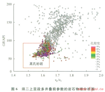 安岳地區(qū)須二上亞段主要為高孔砂巖、致密砂巖和泥巖,從疊后參數(shù)的巖石物理分析結(jié)果看,伽馬、速度、孔隙度各類樣點(diǎn)值分散、疊置,常規(guī)屬性難以區(qū)分出高孔砂巖(圖5)。