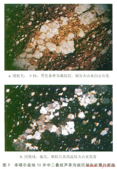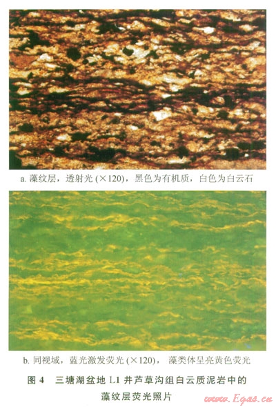 筆者等在陜西省銅川市金鎖關(guān)鎮(zhèn)霸王莊和何家坊上三疊統(tǒng)長7段剖面.:發(fā)現(xiàn)褐黑色油頁巖與灰白色碳酸鹽巖互層,可見多套薄層斑脫土;三塘湖盆地蘆草溝組云質(zhì)泥巖的薄片鑒定和熒光照片也發(fā)現(xiàn)藻類與碳酸鹽巖紋層狀互層(圖4)。