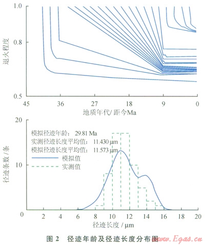 磷灰石裂變徑跡法的熱史模擬步驟為:①根據(jù)已有熱參數(shù)資料,給出熱史約束條件;②設(shè)定大量的溫度時(shí)間曲線,通過(guò)正演求出徑跡長(zhǎng)度、徑跡年齡模擬值;③將正演結(jié)果與實(shí)測(cè)徑跡長(zhǎng)度、年齡進(jìn)行比較,獲得最佳模型,即得到熱史模擬結(jié)果。