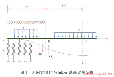 選用Winkler地基模型建立慶咸輸油管線沖溝處懸空管段力學(xué)模型和解析表達(dá)式,針對(duì)事故管段(包括懸空撓曲段和埋地段),作如下力學(xué)假設(shè):